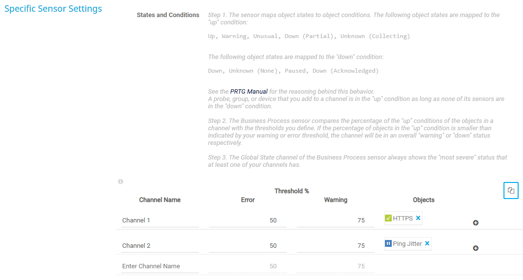 If you encounter issues with your Business Process sensor and want to contact the Paessler support team, send us your exact configuration. Click in the upper-right corner of the Specific Sensor Settings table to copy your configuration: