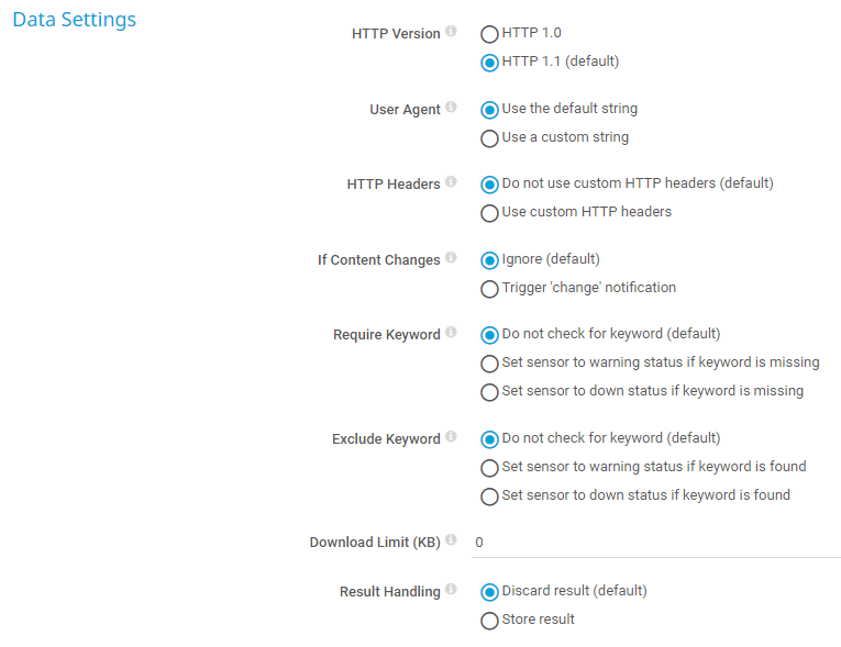 i_round_blueFor debugging, select Store result to write the source code file to disk and to look up what exactly PRTG gets when it calls the URL. If the URL does not point to a web page but to a binary file, for example, to an image, you usually do not check for content.