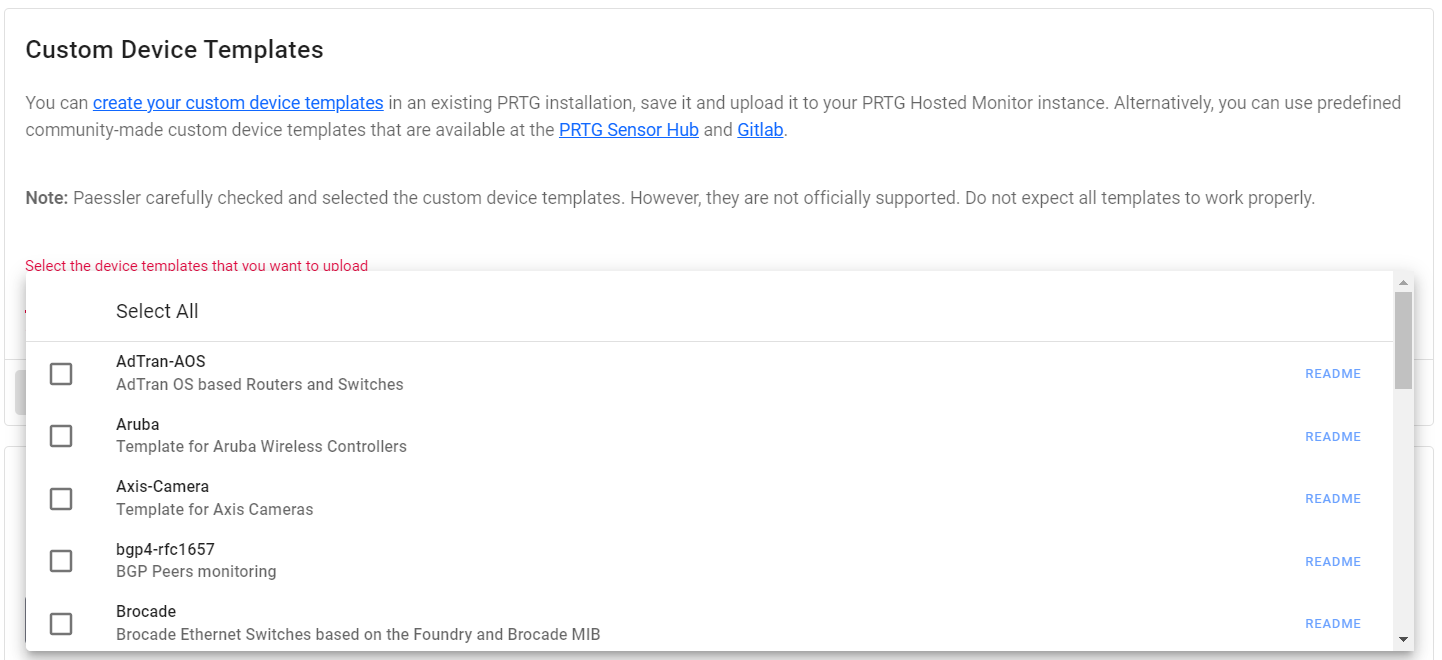 Enable the check box next to one or more device template names to select them. You can also click Readme to open the README.md file of the device template in GitLab.