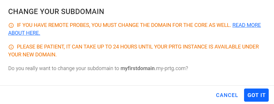 Enter a new domain name such as myfirstdomain. If you enter myfirstdomain as the domain name, for example, your PRTG Hosted Monitor instance is reachable under myfirstdomain.my-prtg.com. If you have remote probes, you must manually change the domain name for the PRTG core server. This corresponds to the Server (IPv4 Address or DNS Name) setting in the PRTG Administration Tool.