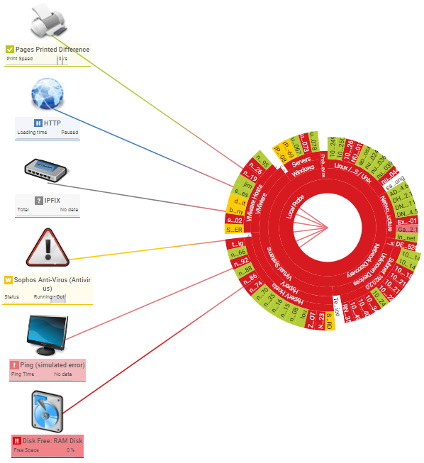 The map designer dynamically colors the lines between items depending on the status of the linked objects. A line is red, for example, if the linked objects both show the Down status. Connection lines can also have two colors. For example, if one linked object shows the Down status and the second linked object shows the Warning status, one half of the line is red and the other half is yellow.